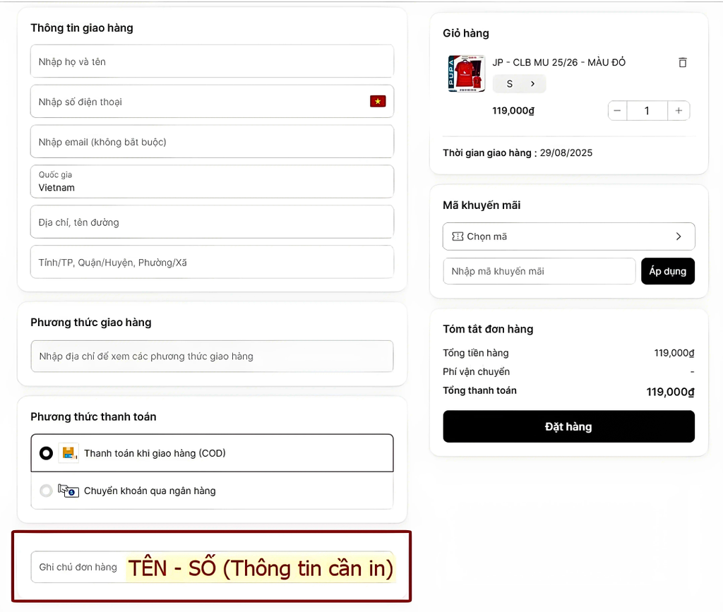 (Trong giao diện đặt hàng, note tên - số (thông tin cần tin) vào phần Ghi chú đơn hàng.)